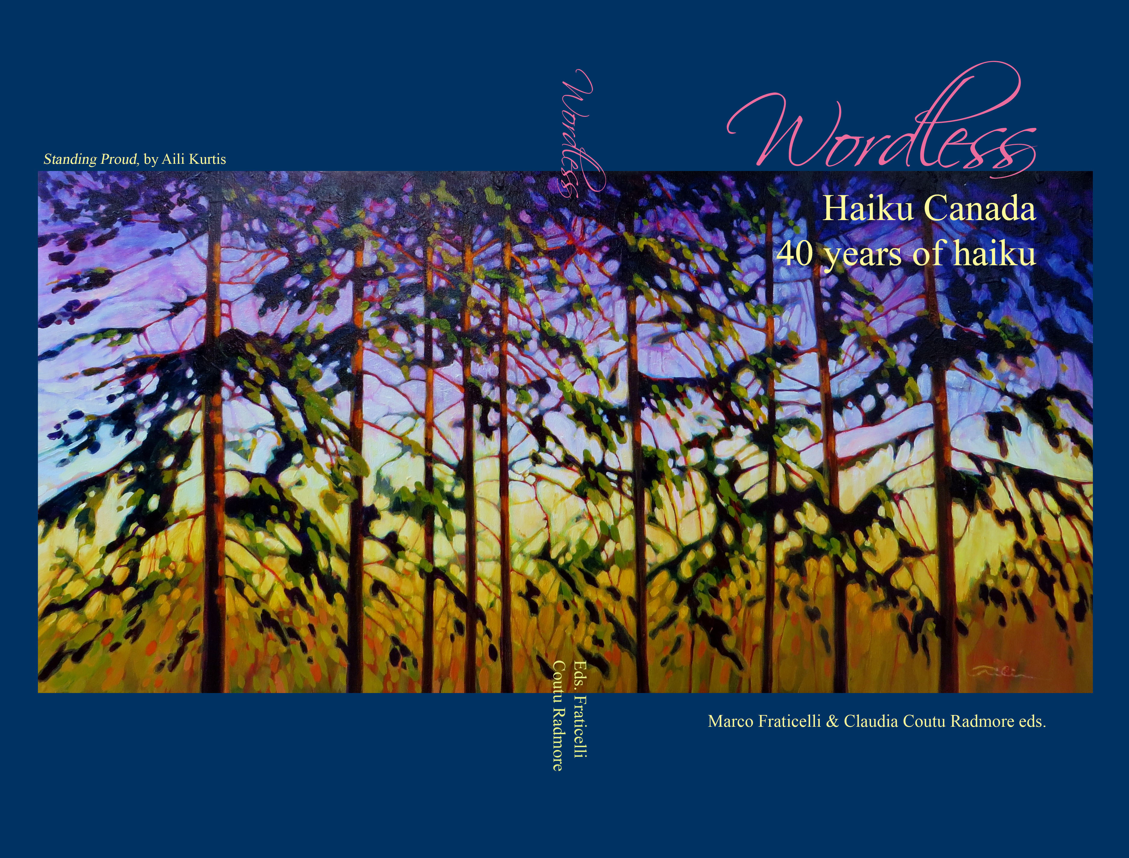 Its title, Wordless, is from a little book Amann wrote early on, which influenced many haikuists. Marco and I learned a lot from co-editing this collection, especially about how accommodating and patient an anthology publisher can be. Richard Olafson of Ekstasis Editions is a dream to work with. I’m sure we were a nightmare to him with our hundreds of edits.  We are so pleased that the cover will feature a painting by Aili Kurtis of Perth. Richard let me design the cover, at least in its first phases. This is an early draft: