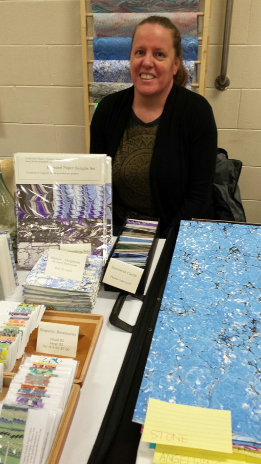 Going around the room to hand out some freebie mini books, I spent time with artist friend Nancy French, here, as usual, with a gorgeous display of hand-marbled papers, and various items made with her Lindenlea Papers, and results of her talents, like bookmarks and notebooks. Time spent with this smile is time well spent.