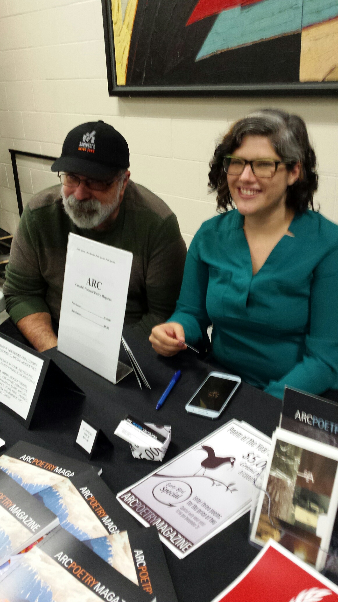 Also showing their wares were rob, with his various press collections, and other Ottawa presses, like Angel House Press and Devil House Press; Stuart Ross with a table that included Mansfield Press titles, who gave me a chapbook, forty-nine cents. Much appreciated Stuart. Here are a couple of fugitives, Jennifer Baker and Monty Reid, at the Arc table, and