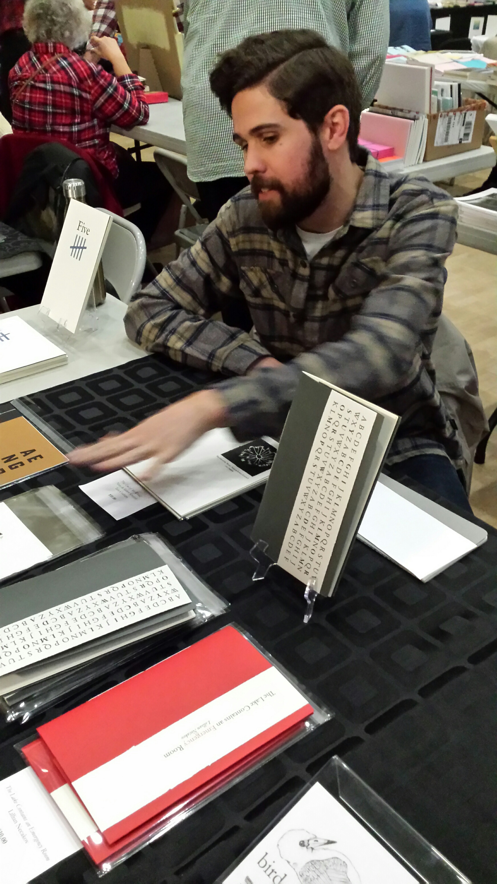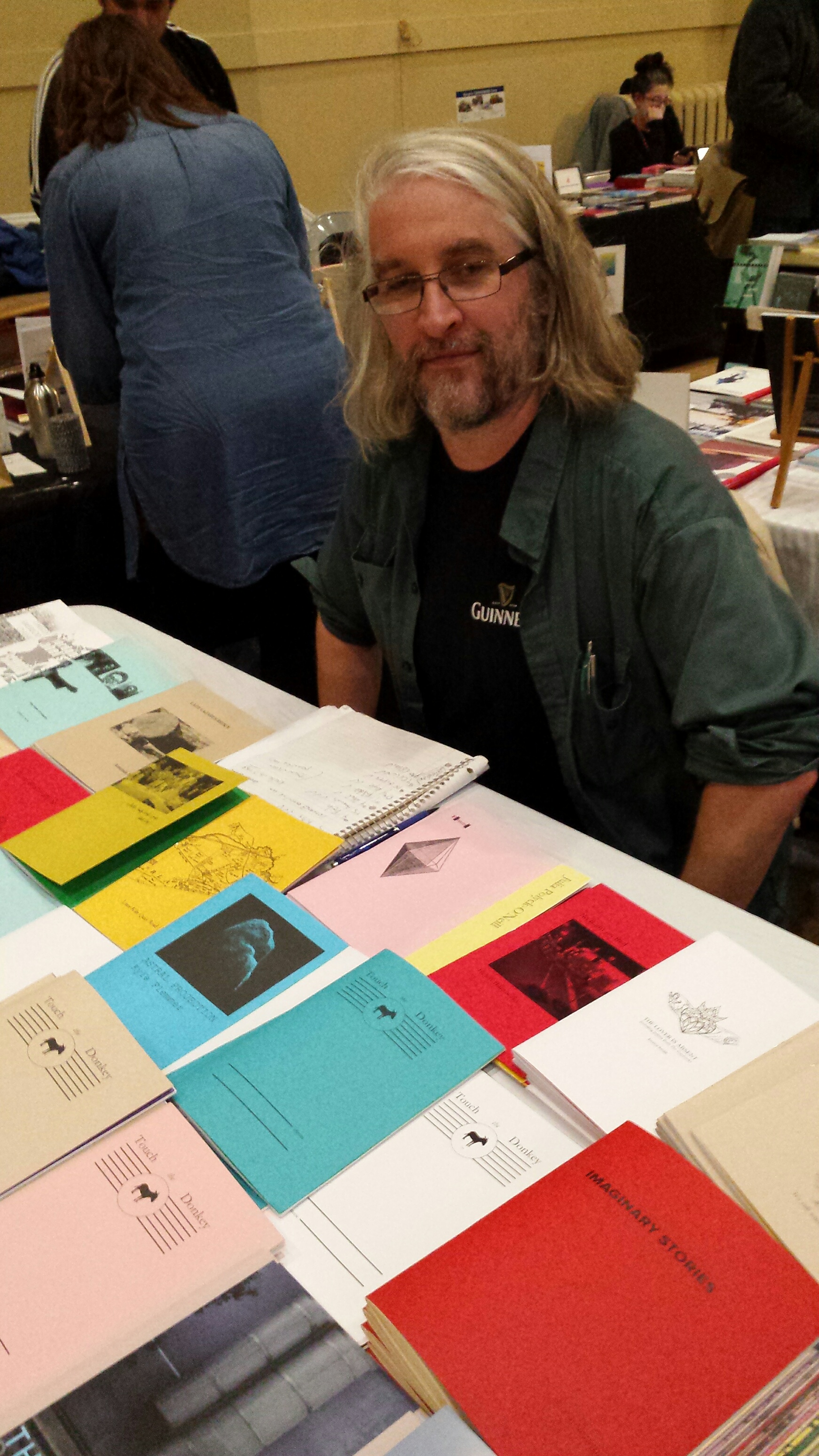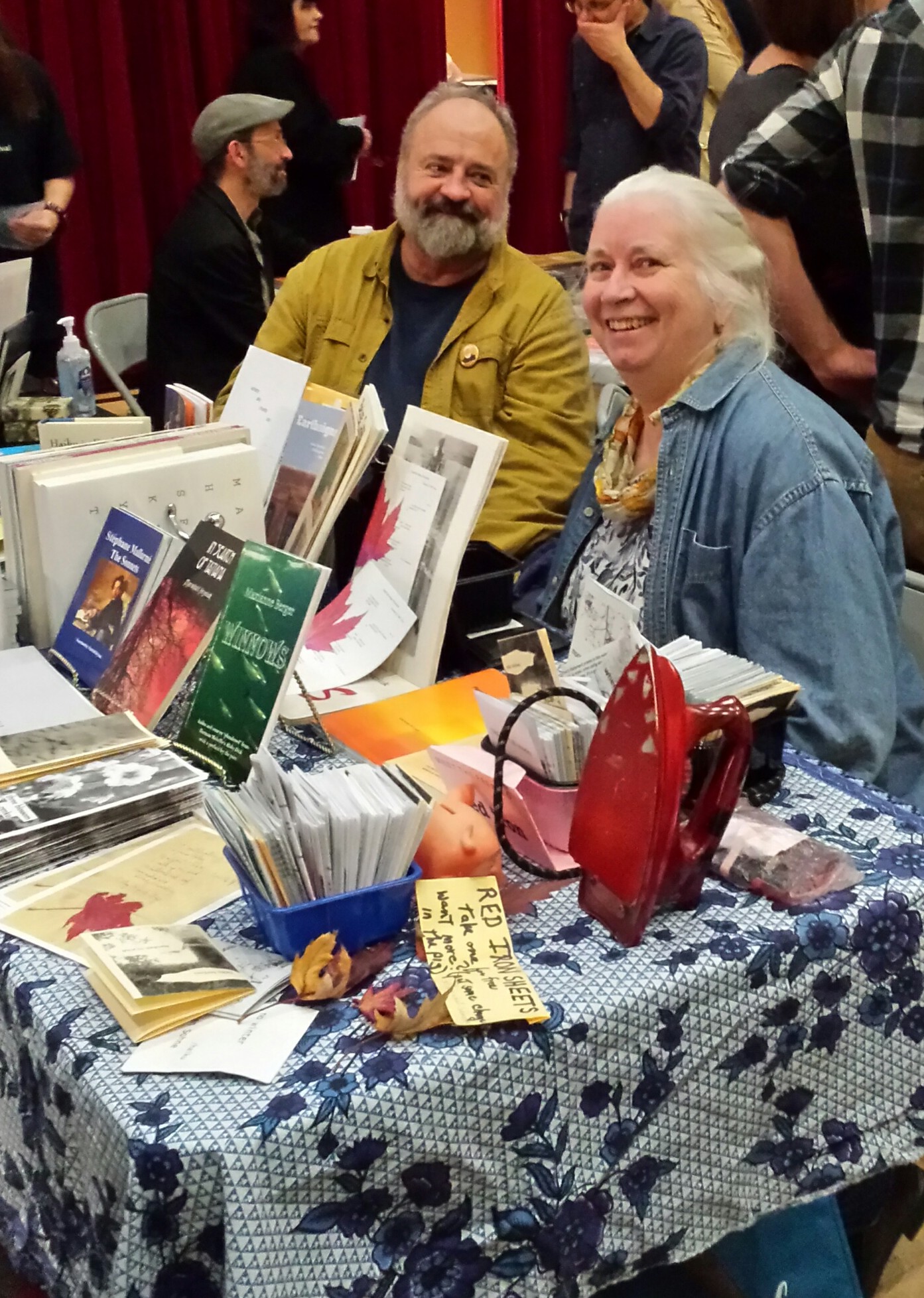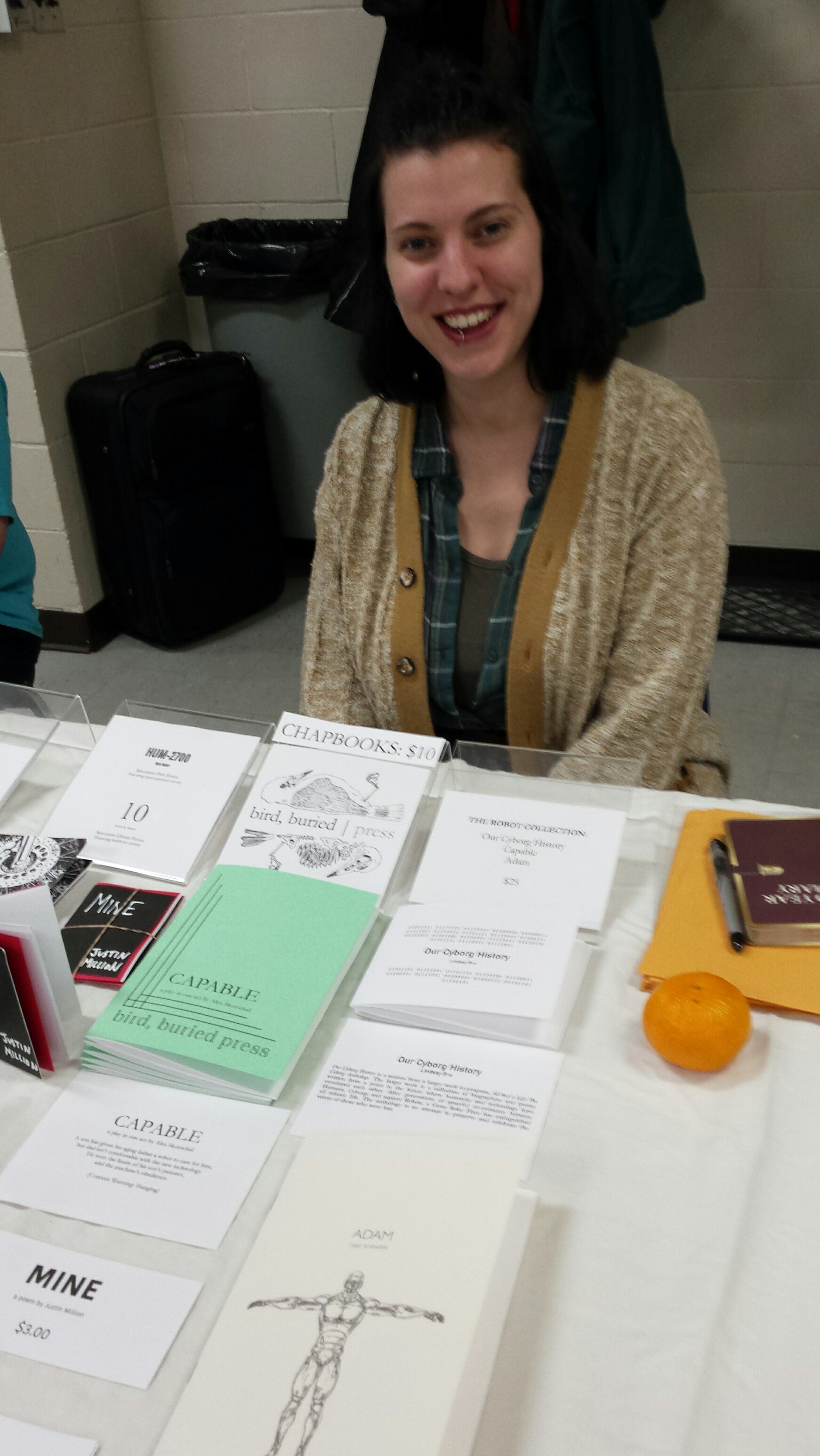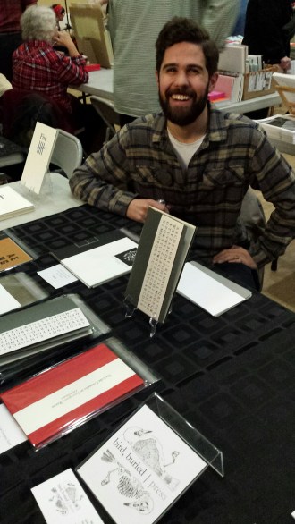 I’ve played around with the display on the bird, buried / press table, to catch your eye. Here is Elisha Rubacha, in charge of that display, one of the friendliest poets you could be sitting next to.