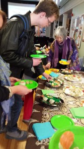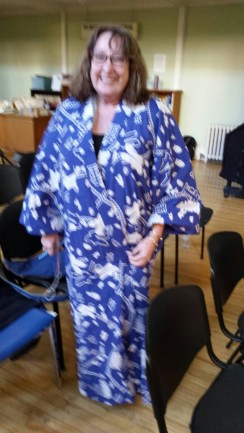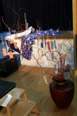 The audience was invited to try them on and have their photos taken if they wished.    Here are Maureen in  a blue-and--white kimono, and my apologies for the image not being clearer, and Forrest in a short black one, which I think he considered was a ninja outfit, and in which  he did a super job of decorating the branches. He is with his mom Sharelle. Forrest also helped with taking the covers off the treats, and making sure the napkins matched the plates. As you can see, thesushi, mochi and sake were a hit.